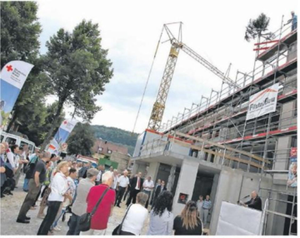 DRK-Kreisverbandspräsident Peter Hofelich hatte die Gäste schon vorher begrüßt. „Es ist ein besonderer Tag für das DRK“, betonte er und äußerte seine Freude darüber, dass die bisherige Bauzeit ohne Unfälle verlaufen ist. „Ambitioniert und gut vorbereitet“ sei das DRK in dieses Projekt gestartet, das voraussichtlich im Frühjahr 2018 fertiggestellt werde. Das Seniorenzentrum wird dann 64 Pflegeplätze zur Verfügung stellen sowie 14 Wohnungen mit betreutem Wohnen. „Zwölf dieser Wohnungen sollen verkauft werden, neun davon sind bereits verkauft“, informierte Hofelich.