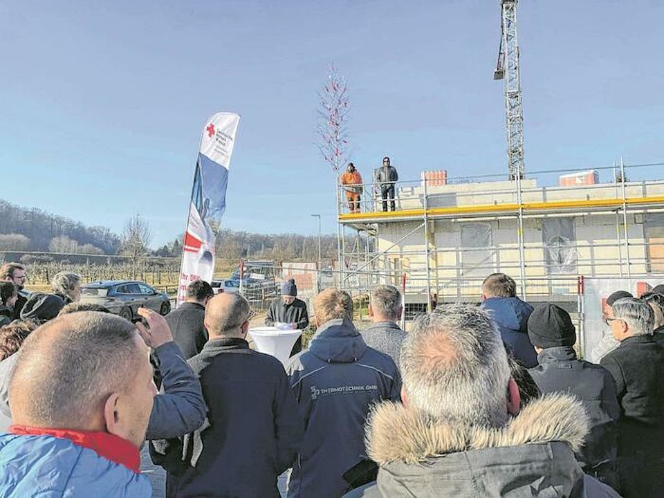 Göppingens Oberbürgermeister Alex Maier, Vertreter des Landratsamtes und des Kreistages, Kollegen weiterer Hilfsorganisationen und der Kliniken ebenso wie der Krankenkassen und der beteiligten Banken und Baufirmen sowie des Architekturbüros und Mitarbeitende des DRK-Kreisverbandes sahen einen Rohbau, der in nur vier Monaten entstanden war. Das Ganze sei „im Zeit- und Kostenrahmen“, verkündete der Präsident des DRK-Kreisverbandes den Gästen bei strahlendem Sonnenschein, aber eisigen Temperaturen.