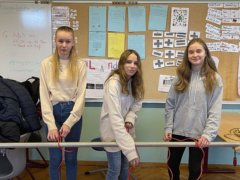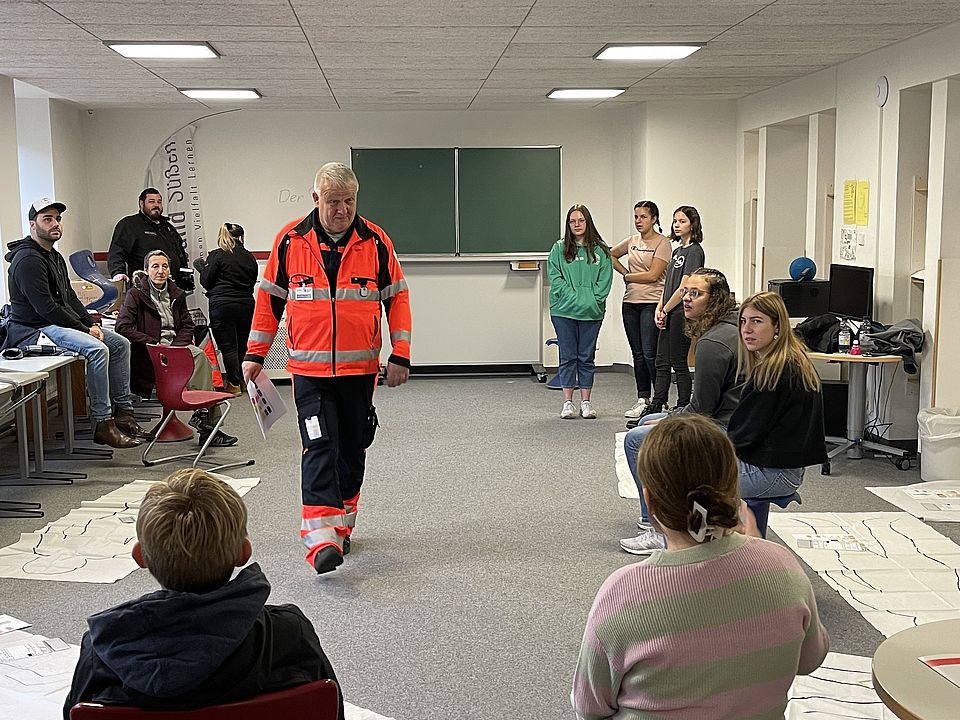 Viel gelacht wurde an der Station der Wasserwacht. Schüler*innen und Lehrer*innen stellten überrascht fest, wie viele unterschiedliche Knoten es gibt. Manche müssen halten, manche nicht. Gar nicht so einfach, da alles richtig zu machen! Rainer Kienzle zeigte, nach welchen Aspekten Verletzte in die Dringlichkeit der Weiterbehandlung eingestuft werden, wenn es viele von ihnen gibt, nach Zugunglücken etwa, einem sogenannten MANV-Szenario. MANV steht hier für Massenanfall an Verletzten. In Rollenspielen und unterstützt durch Scherenschnitte und Kategoriekarten wurde dies mit viel Eifer geübt.