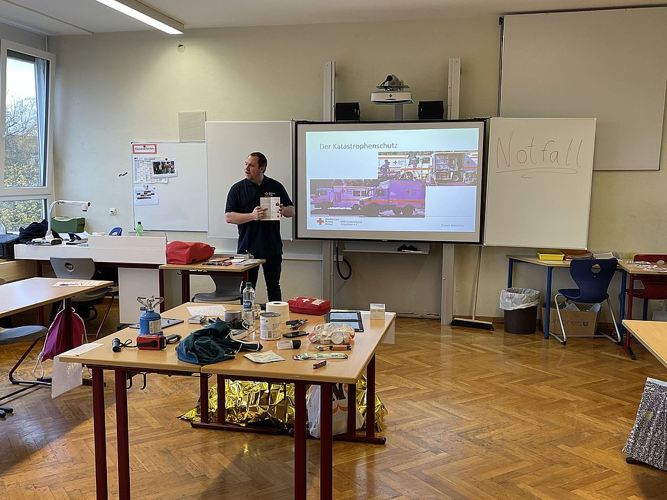 Knapp 30 ehrenamtliche Rotkreuzler*innen hatten sechs unterschiedliche Stationen aufgebaut, an denen die Schulsanitäter*innen theoretische und praktische Anleitungen erhielten und sich selbst ausprobieren konnten. Zunächst wurden sie in Erster Hilfe mit Selbstschutzinhalten geschult. „Was ist zu tun, wenn der Strom ausfällt? Was solltet Ihr zu Hause haben?“, wollten Daniel Schneider und Tanja Kolbe wissen. Sie hatten einen Notfallrucksack dabei und zeigten, was auf keinen Fall in einem Haushalt fehlen darf – dazu gehören Lebensmittel ebenso wie Energiereserven, wie etwa Batterien, Hygieneartikel und die Absicherung von wichtigen Dokumenten oder ein Kurbelradio, um bei Stromausfall noch wichtige Informationen oder Nachrichten hören zu können.