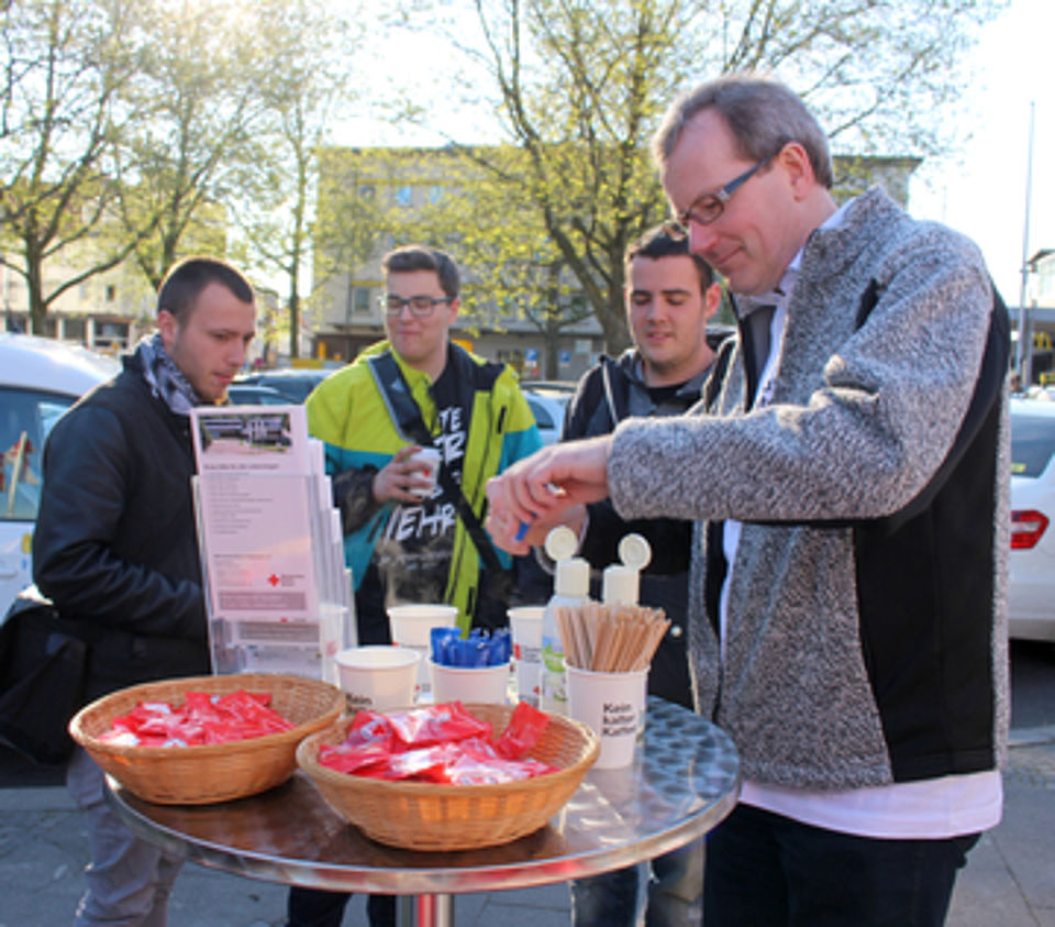 Montagmorgen, halb acht. Alles eilt zum Göppinger Bahnhof hin oder Richtung Innenstadt. „Darf ich Ihnen einen Tasse Kaffee anbieten?“, fragt die Pendler Alexander Sparhuber. Der Kreisgeschäfts-führer war gemeinsam mit Irmgard Weber, der stellvertretenden Vorsitzenden des Kreisverbandes und ehren- und hauptamtlichen Mitarbeitern des DRK an diesem Montag Anfang Mai früh aufge-standen, um im Rahmen der Aktion „Kein kalter Kaffee“ die Pendlern am Göppinger Bahnhof mit einer Tasse Kaffee zu überraschen. „Es ist gar nicht so einfach, etwas zu verschenken“, war die Erfahrung nach den ersten knapp zwei Stunden.