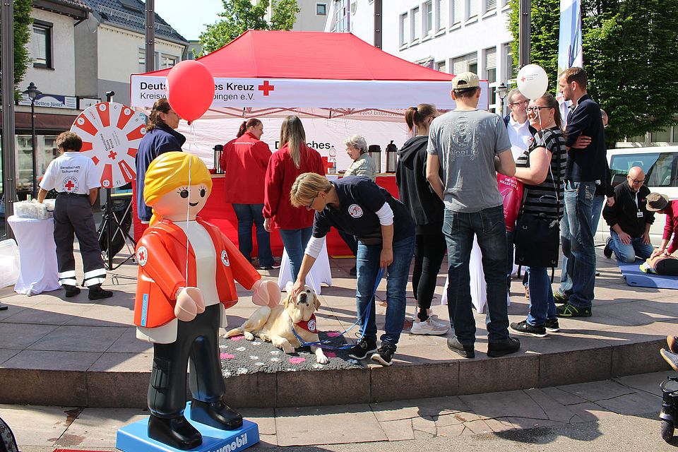 Axel Ost und Ulrich Kienzle vom DRK-Ortsverein Göppingen-Schurwald haben eine Übungspuppe mitgebracht und zeigen den Besuchern des Göppinger Wochenmarktes, wie sie bei einem Herzstillstand lebensrettende Hilfe leisten können. „Vergessen Sie die Beatmung“, antwortet Axel Ost auf eine entsprechende Frage. „Wichtig ist, dass Sie durch Drücken die Funktion des Herzens übernehmen bis der Rettungsdienst eintrifft“. Während ein jüngerer Mann die Reanimation übt, lässt sich eine ältere Dame über die verschiedenen Angebote des DRK für Seniorinnen und Senioren informieren.