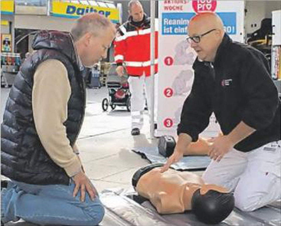 Aus Unwissenheit haben Menschen Angst, anderen zu helfen. „Die Frequenz und die Tiefe des Drucks sind entscheidend“, erklärt Axel Ost, Vorsitzender des Ortsvereins. 100 Mal pro Minute sollte der Brustkorb gleichmäßig etwa sechs Zentimeter eingedrückt werden. „So ersetzen Sie die Pumpleistung des Herzens.“ Das Drücken aus gestreckten Armen ist anstrengend. „Suchen Sie sich deshalb Hilfe und sprechen Sie Umstehende ganz konkret an“, rät Dr. Christian Wagenfeld. „Denn Sie müssen drücken, bis der Rettungswagen eintrifft.