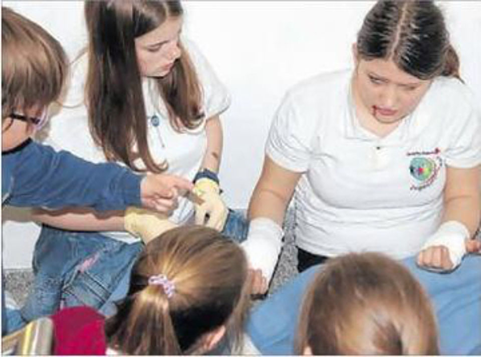 Zu den Höhepunkten gehört die Erste Hilfe. Ein Skateboarder ist über Treppen geskatet und gestürzt. Er hat sich einen Zahn ausgeschlagen und Schürfwunden zugezogen. Die Ersthelfer müssen ihn versorgen. Tamara, Tom und Ben macht dieser Part am meisten Spaß. Das Unfallopfer mimt Ben, die Verletzungen verpasst ihm Tamara – mit Pinsel und Tusche: „Ich hab die Schürfwunden geschminkt und die Verletzung, bei der ihm Blut aus dem Mund gelaufen ist. Das hat richtig echt ausgesehen“, erzählt sie. Tom sieht das Ganze pragmatisch: „Erste Hilfe ist am besten, da kann man sich gleich auf die Sani-Dienste vorbereiten.“ Lustig geht es bei den Fragen über das Rotkreuz-Wissen zu. „Da mussten die Teilnehmer Gesichter von Menschen erkennen, die das Rote Kreuz geprägt haben“, erzählt eine Mitarbeiterin – und grinst: „Als wir ein Bild von Stefan Raab gezeigt haben, war ein Junge fest davon überzeugt, Rainer Kienzle vor sich zu haben“ Der eine ist TV-Moderator, der andere der JRK-Leiter im Kreis Göppingen, beide sehen sich so ähnlich wie Appel und Ei.