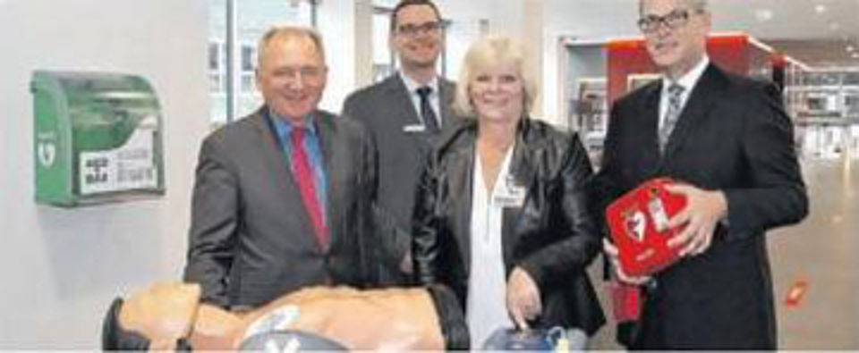 Markus Bofinger, KSK-Mitarbeiter und DRK-Sanitäter (hinten links), DRK-Präsident Peter Hofelich, Sonja Stamos (Leiterin Rotkreuzdienste) und KSK-Pressesprecher Thomas Wolf (von links) gaben nun den Defibrillator frei.