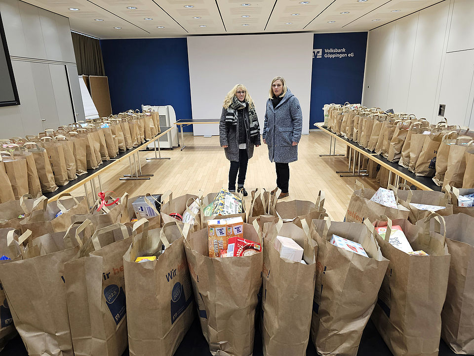 Sabine Rauch vom Eberbacher DRK-Tafelladen stand die Freude ins Gesicht geschrieben, als sie Anfang Dezember in der Hauptstelle der Göppinger Volksbank vor den Spendentüten der Volksbankmitarbeiter*innen stand. „Wow, ich bin geplättet! Vielen, vielen, Dank!“ „Ja, da ist ordentlich was zusammengekommen“, strahlte auch Vorstandreferentin Michaela Staudenmayer, die bei der Volksbank für Spenden und Sponsoring zuständig ist.