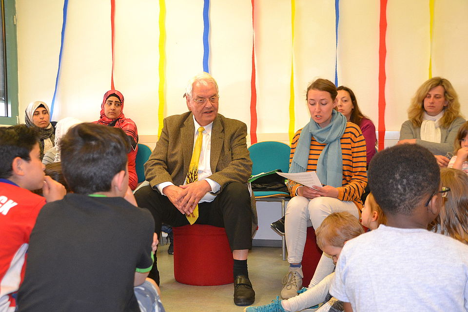 Zu Beginn der Märchenstunde erzählte Hermann Büttner ein arabisches Märchen, bei dem ein Dieb im Gefängnis saß, weil er eine Tabakpfeife gestohlen hatte. Mit viel Pfiff schaffte es der Dieb, allen Instanzen bis hinauf zum König zu verdeutlichen, dass niemand immer ehrlich war und so hat sich der kluge Dieb seine Freiheit zurückerobert. Iman Jaber, gebürtig aus dem Libanon, hat dieses Märchen für die Kinder ins Arabische übersetzt. Die Dolmetscherin für Flüchtlinge lebt selber seit 30 Jahren in Deutschland und hat mit sehr viel Ausdruck die Geschichte um den Birnenkern, den nur pflanzen darf, wer immer ehrlich war, wiedergegeben.