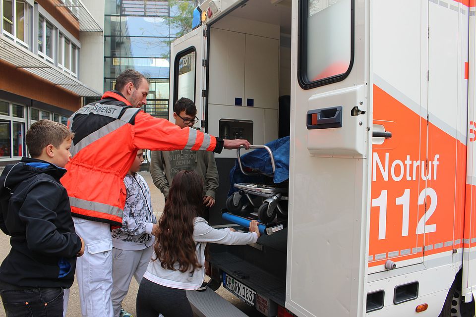 Beim zehnten Schulsanitätstag des DRK-Kreisverbandes Göppingen im Geislinger Helfenstein-Gymnasium stellten Schüler aus dem gesamten Landkreis ihre Professionalität unter Beweis. „Was machen wir, wenn wir den Patienten in den Rettungswagen gebracht haben“, will Ulrich Nemec wissen. „Wir kontrollieren, ob er atmet und machen dann ein EKG“, erhält er die richtige Antwort. „Und dann?“ „Laden zu und abfahren!“ – Ulrich Nemec ist zufrieden.