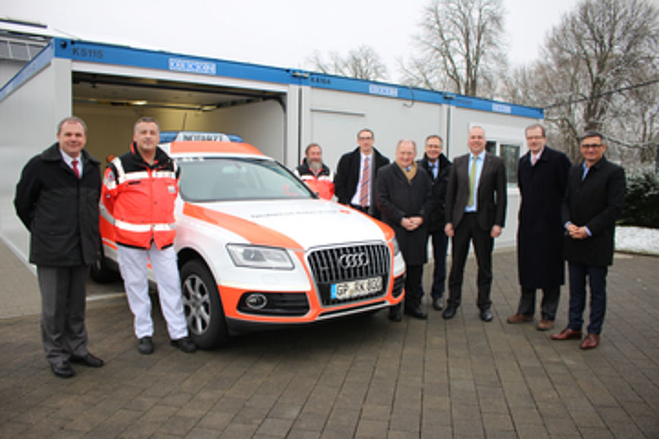 Ein Container mit Aufenthalts- und Ruheraum, eine provisorische Garage für das Notarztfahrzeug – noch sind die Einrichtungen für den dritten Notarztstandort bei der Rettungswache des DRK-Kreisverbandes in Süßen nur für die kommenden zwei Jahre bereitgestellt worden. Bei der offiziellen Einweihung zeigten sich Vertreter der Politik, der Krankenkassen und des DRK indes überzeugt davon, dass die Erfahrungen zeigen werden, dass der Standort wichtig und richtig ist.