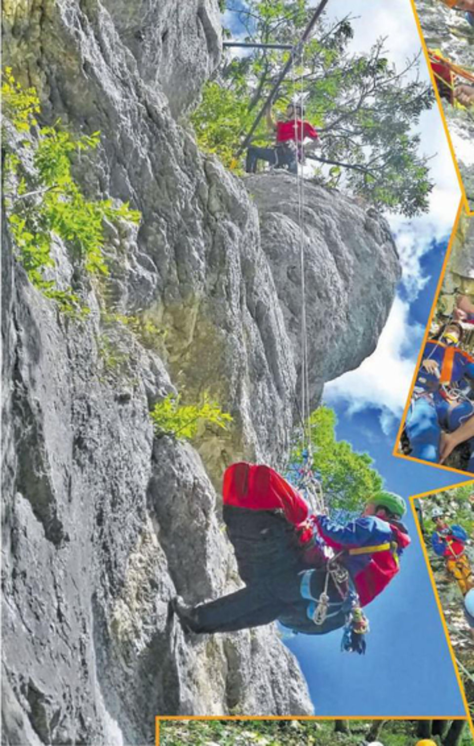 „Präklinische Erstversorgung, Herstellung der Transportfähigkeit, Abtransport bis zur Übernahme durch den Rettungsdienst. Wir fangen da an, wo andere aufhören, bei jedem Wetter, in jedem Gelände, 24 Stunden an 365 Tagen“, betont Günter Wöllhaf, Landesleiter der Bergwacht Württemberg, und ergänzt: „Nicht zu vergessen die Durchführung von Naturschutz-Streifen und Projekten, wie zum Beispiel die Landschaftspflege.“ So ist die Teckmauer zu sehen, weil sie die Bergwacht vom Efeu befreite. Die Bergwacht Württemberg absolviert unter der Einsatzleitung von Tobias Magenau und Bereitschaftsleitung von Edgar Balzer eine aufwendige Großübung mit Sicherungsaufbau im schwer zugänglichen Steilgelände der Schwäbischen Alb zum Wandfuß, Erstversorgung, Rettung sowie Abtransport der Schwerverletzten. Die erfahrenen und intensiv ausgebildeten Helfer unterscheiden in ihrem Tun nicht zwischen Übung, Training oder Ernstfall. Wie bei jedem Unglück kommt es auf die Minute an. Jasmin Kuch und Michelle Clauß werden vor Ort notärztlich versorgt und gut fixiert liegend in einer Gebirgstrage sowie in einem Bergesack routiniert und dennoch vorsichtig hochgetragen oder mittels Zweibein entlang der steilen, überhängenden Felswand nach oben gezogen. Die beiden unverletzten Mädchen von der Jugendfeuerwehr Schopfloch haben sich mutig zur Verfügung gestellt.