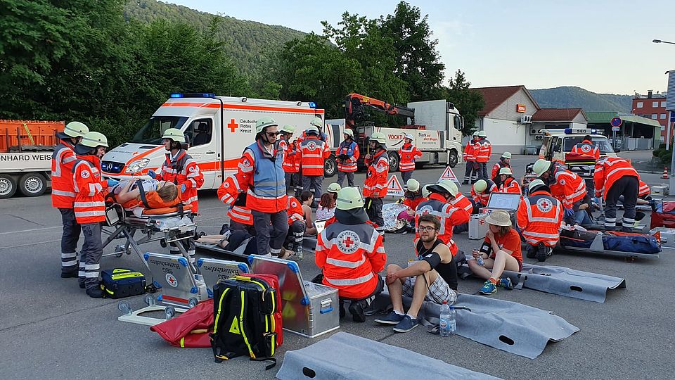 Dieses Szenario bot sich den Helferinnen und Helfern, die in diesem Jahr an der Übung der SEGn teilgenommen haben. Gegen 19.30 Uhr rückten sie vom Bereitstellungsraum in Bad Überkingen in Richtung Geislinger Neuwiesen aus. Auf einem dortigen Parkplatz warteten die Jugendlichen bereits auf Hilfe. Während ein Teil der Einsatzkräfte bereits mit der Versorgung der Patienten begann, sorgten andere Helfende dafür, dass die Behandlungsmodule zur weiteren Patientenversorgung aufgebaut wurden. Ein Modul hat dabei immer Platz für vier Verletzte, des Weiteren liegen dort viele Materialien bereit, um die weitere Versorgung gewährleisten zu können.