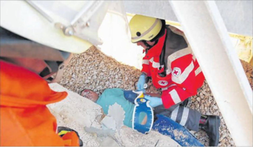 Während sich ein Teil der DRK-Sanitäter um die geretteten Patienten kümmert, Verletzungen diagnostizieren und entsprechende Maßnahmen ergreift, kämpfen Kollegen oben an der Schotteranlage um das Leben eines Schwerverletzten. Der ist ohnmächtig, die üble Platzwunde an der Stirn weist auf eventuelle Schädel- oder Hirnverletzungen hin. Die Helfer haben kaum Platz, sich zu bewegen, geschweige den Verletzten zu behandeln. Nach Halskrause und Kopfverband kommt ein Spine-Board zum Einsatz: Auf dem wird das Unfall-Opfer mit Spezialgurten fixiert. Sechs Helfer sind nötig, um den Schwerverletzten schließlich aus der Nische heraus zu bugsieren und in den bereit stehenden Rettungswagen zu hieven. Die Retter melden ihren Erfolg per Funkgerät und würden den Verletzten im Ernstfall jetzt ins Krankenhaus bringen.