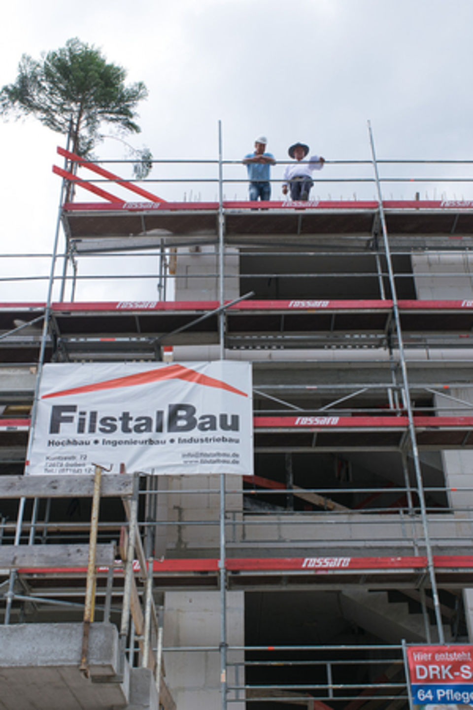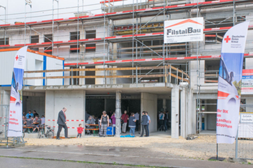 Festorganisatorin Bettina Merten hatte auch für diesen Fall vorgesorgt und im Innern des Rohbaus Biertische und -bänke aufstellen lassen. Die nächsten Redner – der Geislinger Oberbürgermeister Frank Dehmer und der DRK-Geschäftsführer des Kreisverbandes Nürtingen-Kirchheim/Teck, Klaus Rau – konnten somit den Gästen im Trockenen ihre Begeisterung über das große DRK-Projekt schildern.