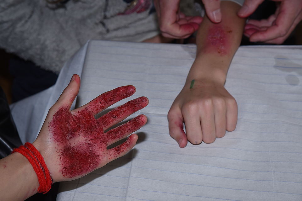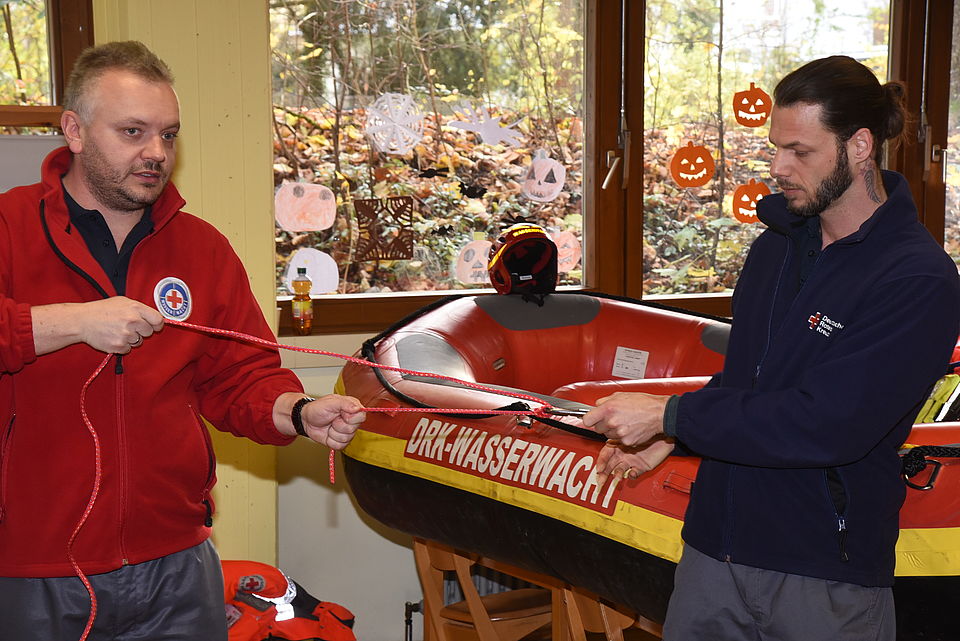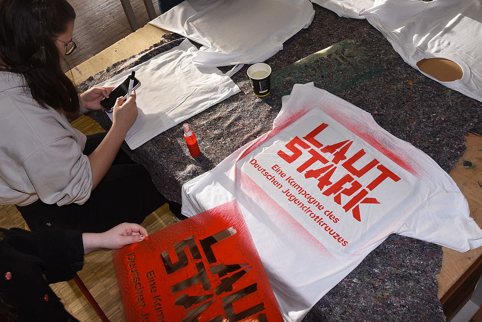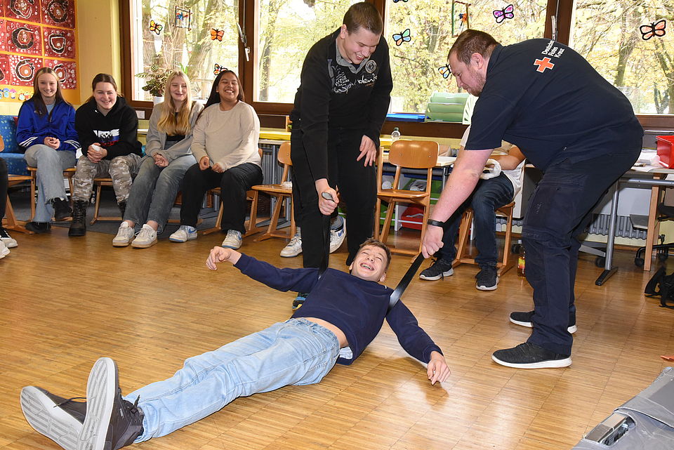 Und sie lernen auch Neues kennen. Neu ist für viele ein großes Schlauchboot im Klassenzimmer. Die Mitarbeiter*innen der DRK-Wasserwacht haben es mitgebracht, im Klassenraum aufgeblasen und auf ein paar Tische gestellt. Mit dabei haben die Männer der Wasserwacht auch jede Menge Bänder und Seile, sie führen den Schulsanitäter*innen die verschiedensten Knoten und Knoten-Techniken vor, je nachdem wer oder was gesichert werden soll. Nicht knoten, sondern malen können die Schulsanitäter*innen im Werkraum der Schule. T-Shirts oder Stofftaschen können per Schablone und Farbe mit einem Aufdruck versehen werden, besonders beliebt sind „lautstarke“ weiße T-Shirts, die mit dem „Lautstark“-Logo der gleichnamigen Jugendrotkreuz-Kampagne bedruckt werden können, gerne in knallrot. So ein bisschen Rot gibt es auch im Raum der „Notfalldarstellung“, dort geht es zu wie im Schminkraum in Hollywood: Ausbilder Torsten Seipel zeigt den Schülern, wie „Unfallopfer“ für eine DRK-Übung geschminkt werden. Für eine ordentliche Verbrennung am Arm braucht er nur etwas rote Farbe und Gelatine-Platten aus dem Supermarkt. Unter die Gelatine-Platten hält er ein Feuerzeug, die Platten mit den „Brandblasen“ werden dann kurz in Wasser eingelegt, dann sind sie weich genug und kommen auf den schon rot eingefärbten Unterarm des „Opfers“, sieht ganz schön echt aus. Wie Verletzte transportiert werden können – mit oder ohne Trage, das führt der Hattenhofener DRK-Bereitschaftsleiter Daniel Schneider vor. Mit der Trage ist es relativ einfach: drauflegen, anschnallen und dann – wichtig – Trage vorne und hinten gleichzeitig hochheben. Und ohne Trage? Auch ganz einfach, mit dem Gürtel. Also Gürtel raus, irgendjemand hat immer einen dabei, und dann den Gürtel unter den Achseln des Verletzten verlegen und ziehen, möglichst mit zwei Personen, zur Not geht es auch allein. Vor allem wenn Verletzte schnell aus einem Gefahrenbereich gebracht werden müssen und keine Trage zur Hand ist, kommt die Gürteltechnik zum Einsatz. Enger schnallen müssen die Schulsanitäter ihre Gürtel aber nicht, die DRK-Bereitschaft Hattenhofen hat auch ein Mittagessen gekocht, Hamburger satt für alle.