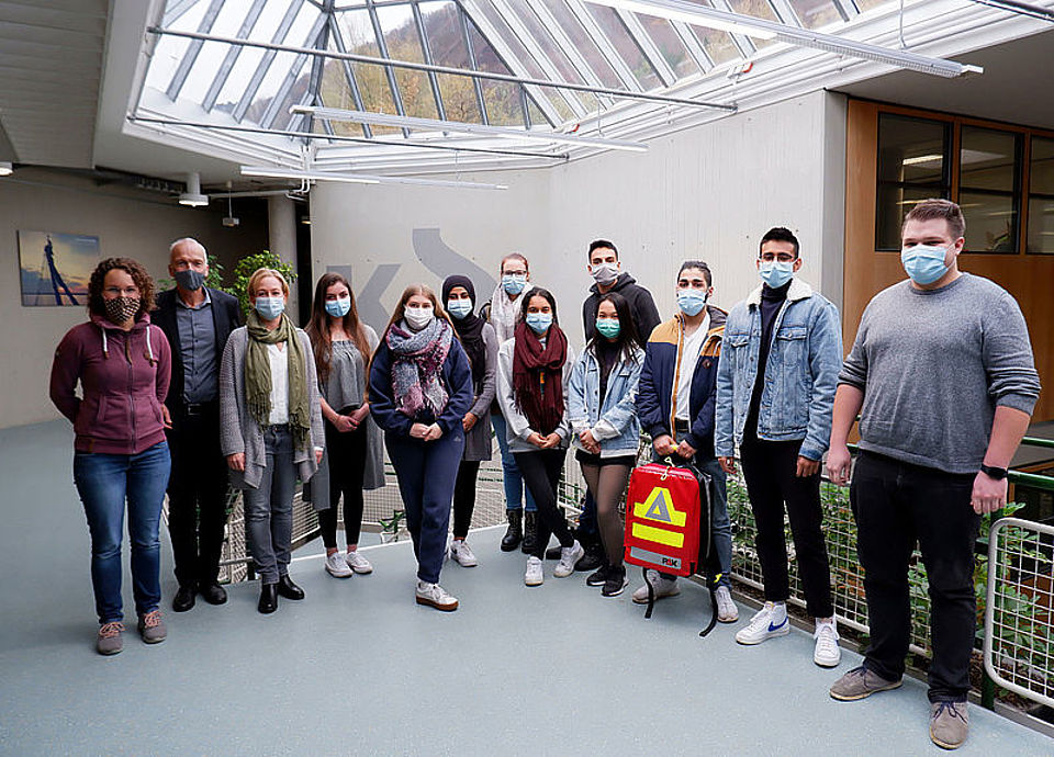 Seit Anfang November sind die jeweils diensthabenden Helfer nun im Einsatz und per Handy aus jedem Klassenzimmer und der Turnhalle erreichbar. Setzt ein Lehrer einen Notruf ab, können die Helfer durch den kurzen Weg binnen kürzester Zeit in das Klassenzimmer zu Hilfe kommen und übernehmen auch in ernsteren Fällen die Betreuung, bis der Notarzt vor Ort ist. Ausgestattet sind die Schüler unter anderem mit Pulsmessgerät, Verbandsmaterial, Halskrause und Beatmungsmaske. In den ersten drei Wochen kamen sie bereits mehr als zehn Mal zum Einsatz, was zeigt, wie hilfreich dieser Dienst für die Schule ist. Das sieht auch Schulleiter Roland Rimbach so, der das ehrenamtliche Engagement der Schüler ausdrücklich lobt: „Für unsere Schulgemeinschaft ist der Schulsanitätsdienst ein großer Zugewinn, stärkt er doch das soziale Miteinander und gewährleistet eine kompetente Erstversorgung.“