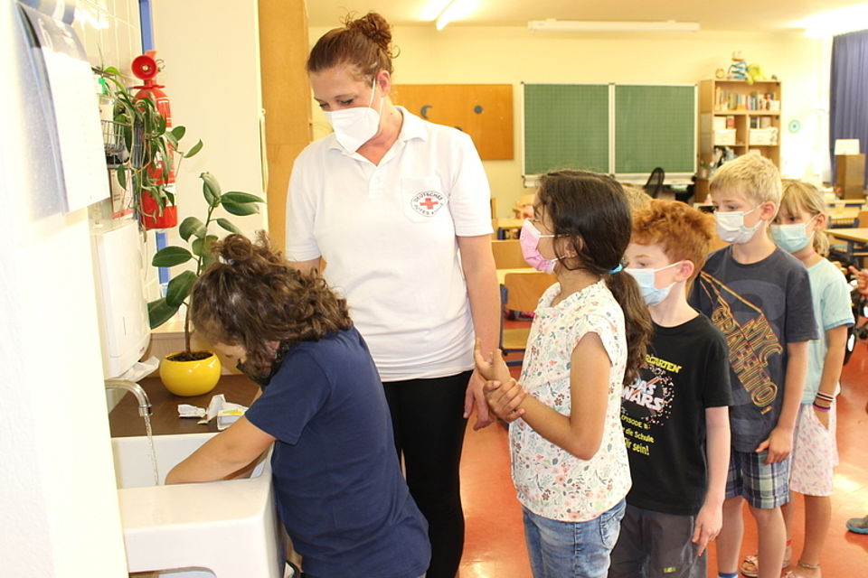 Ebenso wichtig wie Abstandhalten ist die Hygiene. Dass es auf das richtige Händewaschen ankommt, macht Tanja Kolbe mit einem ganz einfachen Experiment sichtbar. In einen Becher mit Wasser schüttet sie Pfeffer. „Steckt Euren Finger rein und zieht ihn wieder heraus. Was sehr ihr?“ „Der Pfeffer bleibt hängen“, beobachtet ein Mädchen. „Und jetzt waschen wir die Hände,“ fordert die hauptamtliche Mitarbeiterin des DRK auf. Vor dem Waschbecken bildet sich eine Schlange. Genau beobachtet sie, wer wie die Hände wäscht. Das Experiment mit dem Wasserbecher wird jetzt wiederholt. Und siehe: „Der Pfeffer geht auf die Seite.“