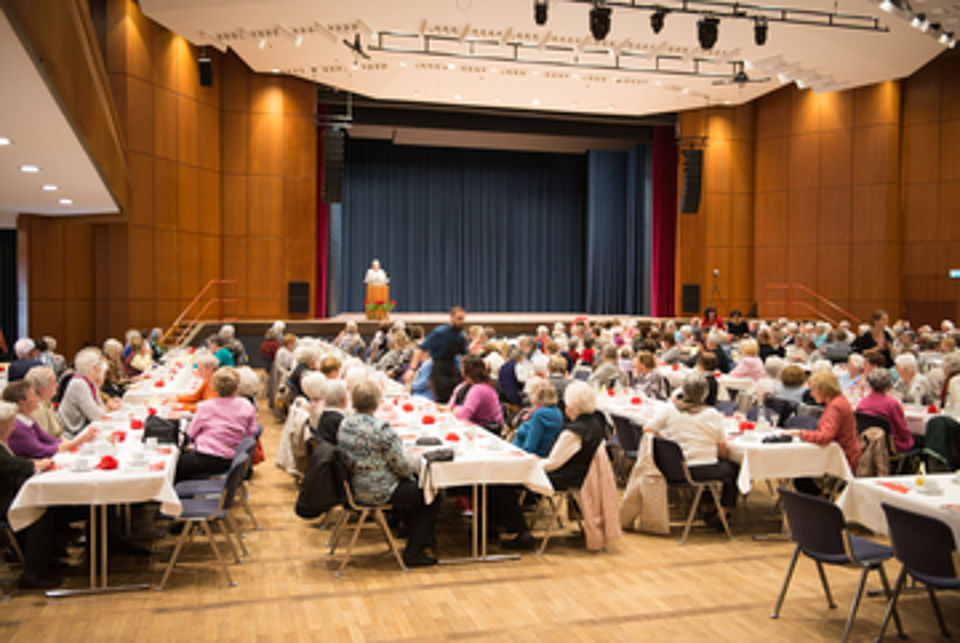 „Hoffentlich haben sie gut eingeheizt!“. Die Hoffnung einer Besucherin des Seniorennachmittags des DRK-Kreisverbandes Göppingen wurde nicht enttäuscht. In der Göppinger Stadthalle ließen sich die rund 350 Besucher die Laune vom widrigen Aprilwetter nicht vermiesen. Sie freuten sich, langjährige Bekannte und Weggefährten wieder zu treffen und ließen sich bei Kaffee und Kuchen von den vielfältigen und temperamentvollen Vorführungen auf der Bühne des großen Saales bestens unterhalten.