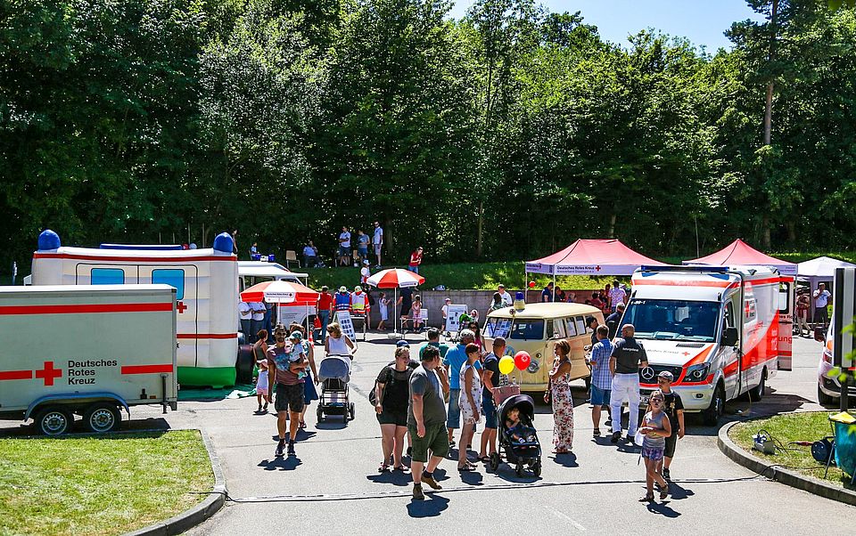 Besonders großer Andrang herrschte bei einer Schauübung am Nachmittag. Dabei zeigten verschiedene Gliederungen des DRK ihre Leistungsfähigkeit und wie reibungslos das Zusammenspiel im Notfall funktioniert. Ehrenamt und Hauptamt arbeiteten bei der simulierten Rettung einer abgestürzten Fallschirmspringerin Hand in Hand. Die Notfallrettung wurde unter echten Bedingungen simuliert, inklusive Verkehrssperrung und Bergung einer vom Team Notfalldarstellung täuschend echt geschminkten DRK-Mitarbeiterin, die bis zu ihrer Rettung in einem hohen Baum verharrte.