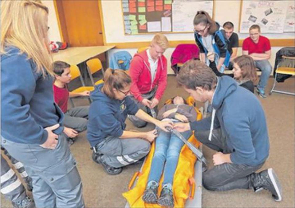 Einen Schock stellten die Jugendlichen mit einem Rollenspiel dar – indem sie im Kreis marschierten, was den Blutkreislauf symbolisierte. Eva Allmannsdörfer und Tobias Thomas entfernten nach und nach Personen, die anderen mussten rennen, um den Kreis zu schließen. „Das zeigt, wie der Körper bei Blutverlust reagiert. Der Puls steigt, der Blutdruck sinkt“, sagte Allmannsdörfer.