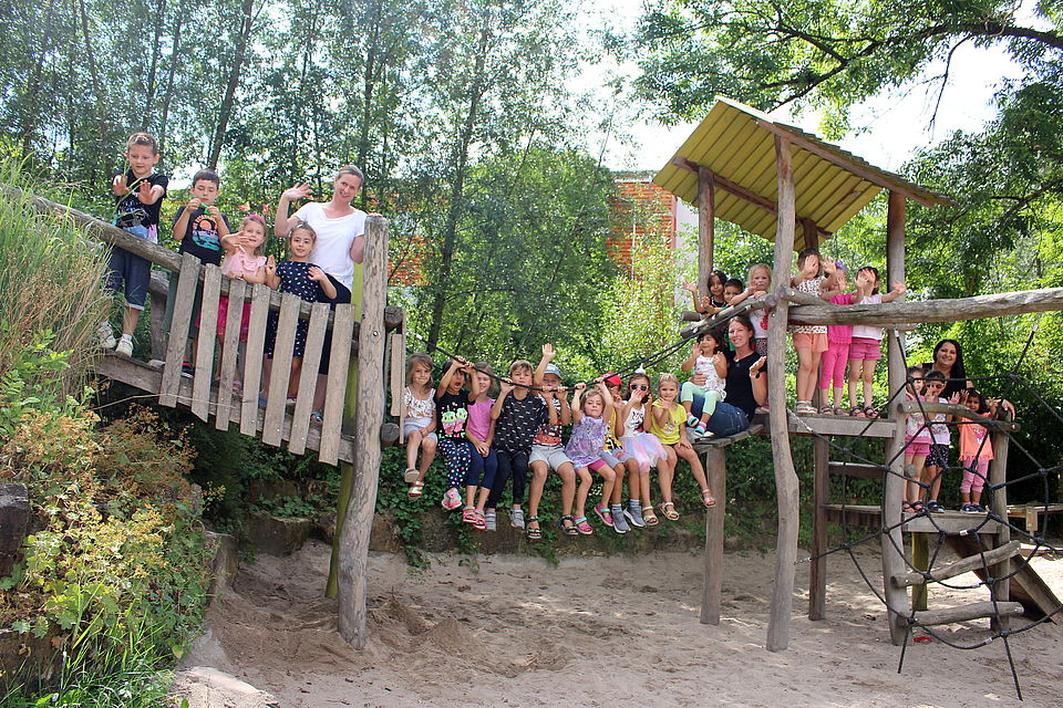 Im Garten bieten viele ganz unterschiedliche Spielgeräte und ein Klettergerüst den Kindern vielfältige Möglichkeiten, sich zu bewegen, zu sandeln, zu rutschen und zu klettern und gleichzeitig ruhige Bereiche, in die sich die Kinder zurückziehen können.