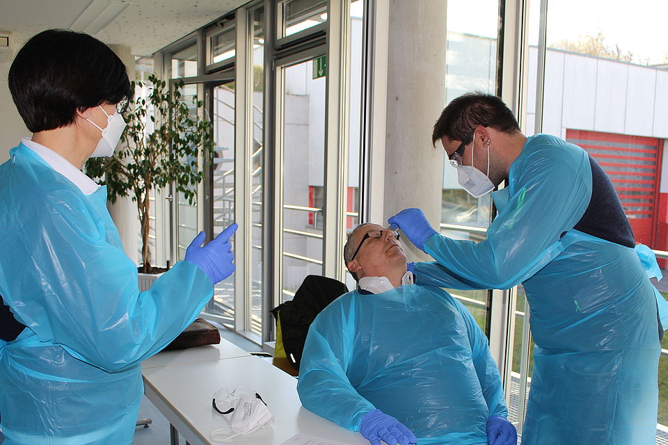 Nach einer theoretischen Einführung üben Ralf Schmidt und seine Mitarbeitenden den Gebrauch des Corona-Schnelltestes. „Kann ich jemand verletzten?“, will eine Teilnehmerin wissen. „Nein!“, ist die klare Antwort von Bettina Steinbacher. „Bevor wir beginnen, ziehen wir die Schutzkleidung an.“ Sie gibt Tipps, wie der Kittel am besten anzuziehen ist, weist an, „das erste Paar Einweghandschuhe sauber über die Ärmel zu ziehen“ und dann ein zweites Paar, das nach jedem Test entsorgt wird, darüber zu ziehen. Eine Schutzbrille vervollständigt den Schutz.