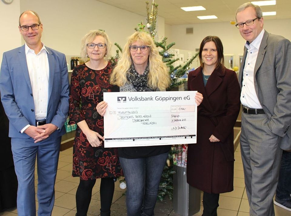 Ebersbach - Die Volksbank Göppingen hat dem Tafelladen in Ebersbach 5000 Euro gespendet. „Wir können den Betrieb des Tafelladens ohne Spenden nur schwer aufrechterhalten“, sagte der Geschäftsführer des Deutschen Roten Kreuzes im Kreis, Alexander Sparhuber, bei der Übergabe des Schecks. Die Hilfsorganisation betreibt die Einrichtung für Bedürftige in Ebersbach. Zwar bekomme die Tafel die Lebensmittel umsonst. Doch die Einnahmen aus dem Verkauf der Waren reichten nicht aus, um die Löhne für die Angestellten sowie den Unterhalt von Räumen und Fahrzeugen zu bezahlen. „Ohne Ihre Unterstützung wäre der Abmangel des Tafelladens deutlich höher“, sagte Sparhuber. Vorstandsmitglied Dr. Lukas Kuhn und die für Marketing und Kommunikation zuständige Simone Stuhler bekamen bei der Scheckübergabe einen Einblick in die Arbeit des Ladenteams. „Besonders Milchprodukte sowie Fleisch- und Wurstwaren fehlen sehr oft“, sagte Leiterin Sabine Rauch. Der Tafelladen in Ebersbach ist dienstags, mittwochs und freitags von 11 bis 13 Uhr geöffnet. Für den Einkauf ist ein Nachweis der Bedürftigkeit erforderlich.