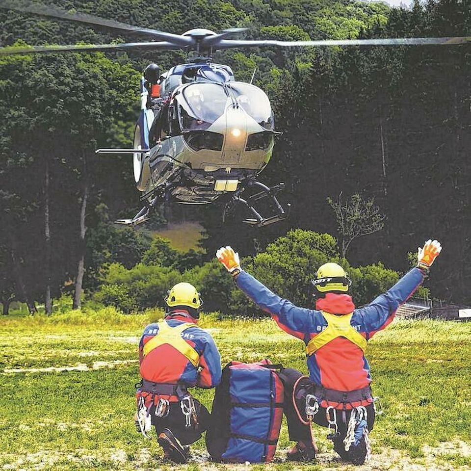 Während seine Bergwacht-Kollegen sich mit dem notwendigen Material durch das unwegsame Gelände zu der Patientin am Fuß des Reußensteins kämpften, legte Jonas Keck sich seine Ausrüstung samt Gurt an, um als Luftretter tätig zu werden. Der Hubschrauber holte ihn oberhalb des Reußensteins bei einer kurzen Zwischenlandung ab. An Bord waren bereits der Pilot und ein Notfallsanitäter, der als Winden-Operator im Einsatz war. „In der Regel ist auch ein Notarzt mit im Hubschrauber, aber damals nicht, weil bereits einer beim Bodentrupp dabei war“, berichtet Jonas Keck. Als er schließlich hoch über der Unfallstelle, mit einem Haken am Seil der Hubschrauber-Winde befestigt, aus der Tür ins Freie geschwenkt und dann zu der verletzten Frau abgelassen wurde, hatte die Bodentruppe die Frau bereits in einem Hubschrauberbergesack stabil gelagert.