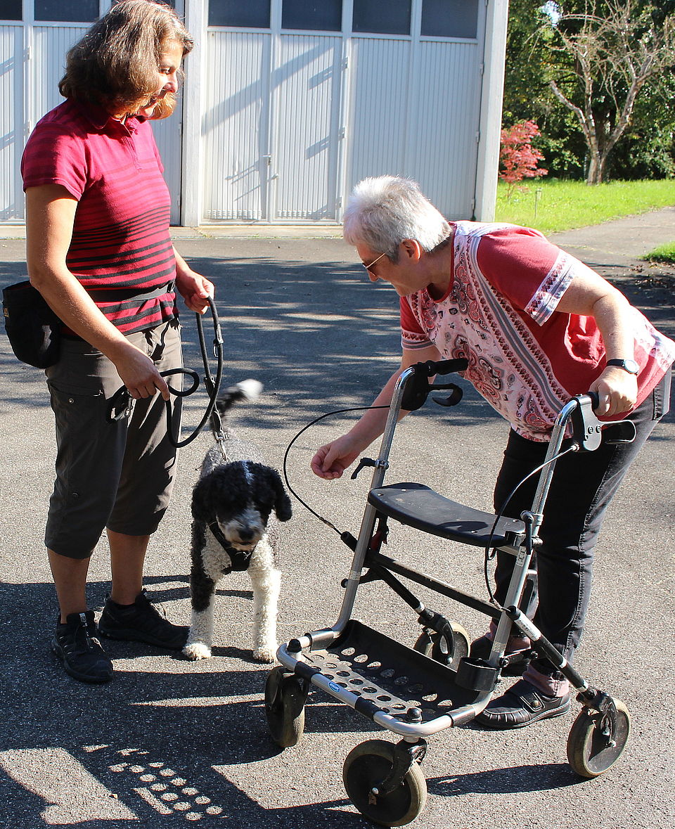 Der Havanese Tommi war eigens beim Friseur und fällt etwas aus dem Rahmen. Er ist klein, wird aber mit seinen großen schwarzen Augen sicher alle Herzen im Sturm erobern. Frauchen Annette Faenger suchte „neben der Arbeit in der Bereitschaft eine neue Aufgabe“. Sie nimmt Tommi auf den Arm und Rollator-Frau Claudia Schmitt-Neumann streichelt ihn begeistert.