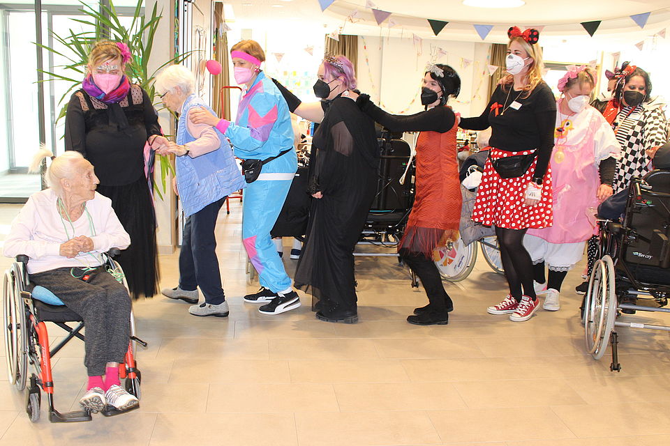 Dann zieht das Pflege-Team mit seiner „Polonaise-Blankenese“ durch den Saal und einige der älteren Herrschaften nehmen begeistert teil – sogar im Rollstuhl! Der DJ nimmt Musikwünsche entgegen und alle sind begeistert: „So eine schöne Musik!“ ruft eine Bewohnerin aus. Alle sind sich einig: „Das ist ein ganz besonderer Nachmittag gewesen!“