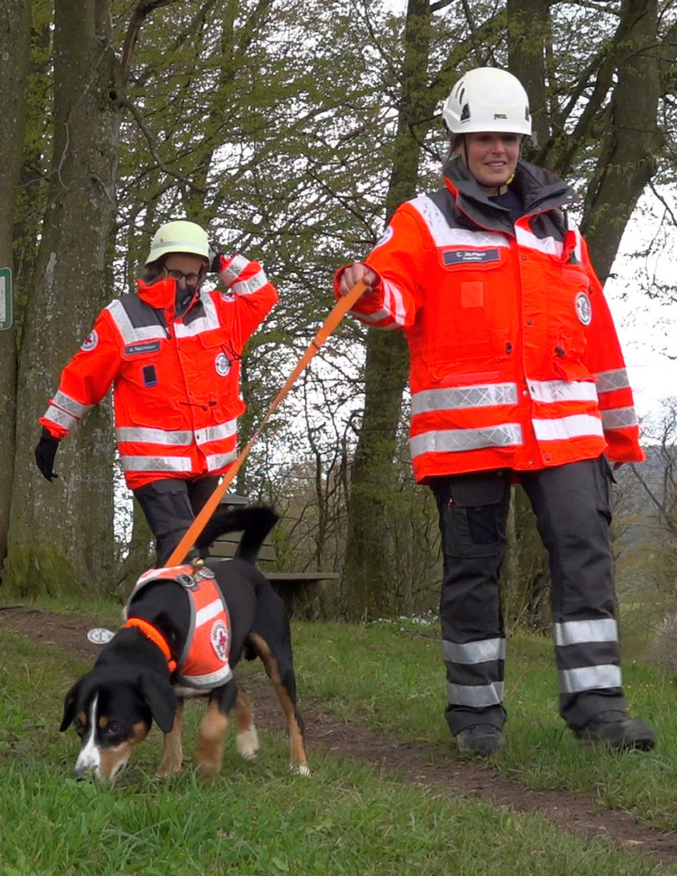 Vorführungen der Rettungshundestaffel des DRK-Kreisverbandes stoßen immer auf großes Interesse. Die Fertigkeiten der Hunde beeindrucken das Publikum – ob beim Göppinger Stadtfest oder beim Tag der offenen Tür beim DRK-Ortsverein Hattenhofen-Voralb gleichermaßen. „Derzeit haben wir 16 aktive Teams“, informiert Staffelleiterin Tanja Bertermann. „Seit knapp zwei Jahren bilden wir auch wieder Mantrailer aus. Es gibt immer wieder Hundeführer*innen, die Interesse haben“, freut sie sich. Viele würde dann aber der große Zeitaufwand abschrecken. Denn das reibungslose Zusammenspiel von Mensch und Tier „muss regelmäßig trainiert werden“. Hundeführer*innen müssen also bereit sein, einen großen Teil ihrer Freizeit in das Ehrenamt einzubringen. „Sie müssen zudem teamfähig und körperlich fit und sollten älter als 16 Jahre sein“, so Tanja Bertermann. Für die Arbeit als Rettungshund „sind mittelgroße Hunde geeignet. Sie müssen sozialverträglich, gut motivierbar, also gerne spielen oder fressen, und maximal vier bis fünf Jahre alt sein.“ Besser sei es bereits mit Welpen im Alter von zehn bis zwölf Wochen mit der Ausbildung zu beginnen. Denn mit ca. zehn bis elf Jahren, abhängig von der Rasse, können die Hunde die anstrengenden Einsätze nicht mehr ausüben. Da ihre Ausbildung aber aufwändig sei, „empfiehlt es sich, möglichst frühzeitig damit zu beginnen“.