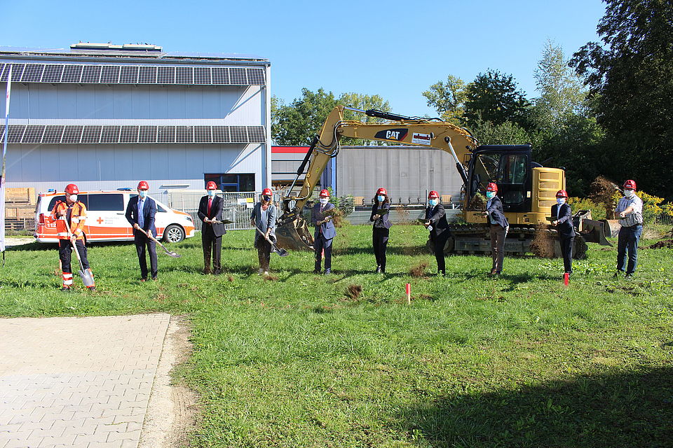 Mit dem symbolischen Spatenstich gaben der Präsident des DRK-Kreisverbandes Göppingen, AOK-Neckar-Fils-Geschäftsführerin Heike Kallfass, Dr. Ingo Hüttner, Geschäftsführer der Alb Fils Kliniken und zahlreiche langjährige Partner die Bauarbeiten für die „weitere qualitätvolle und zukunftsfähige Notfallversorgung der Menschen im Landkreis“, so Heike Kallfass in ihrem Grußwort, frei.