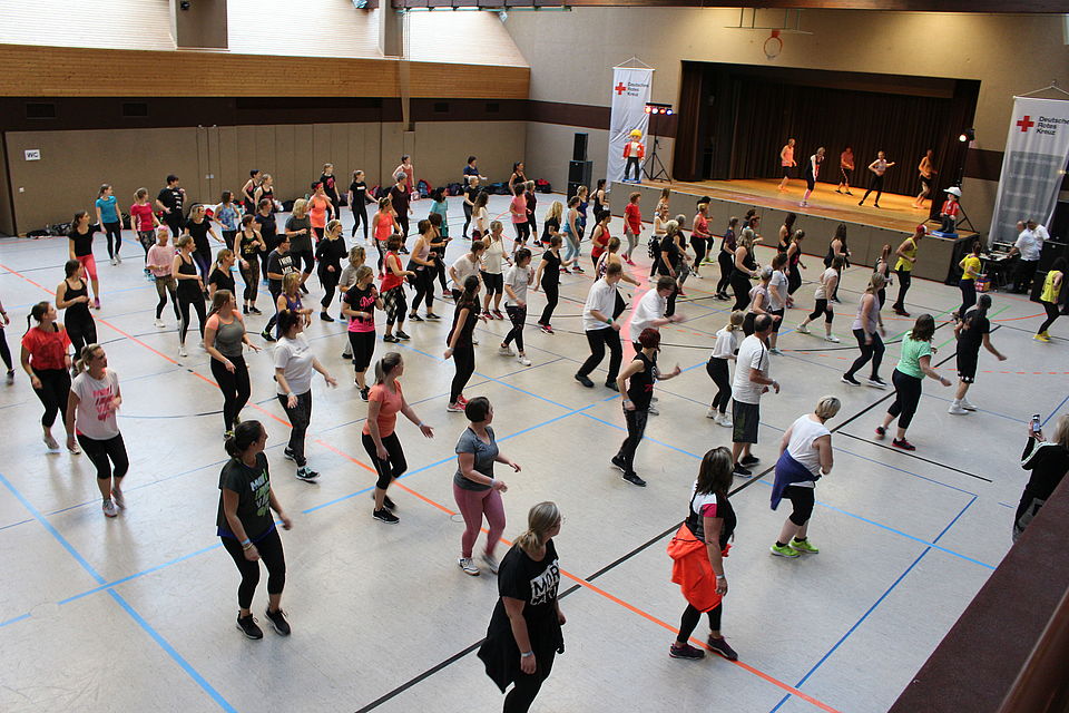 Schwitzen für den guten Zweck: So lautete die Devise des Deutschen Roten Kreuzes am Sonntag. Begeisterte Gäste, vorwiegend weiblich, kamen voller Motivation in die Autalhalle in Bad Überkingen, um für drei Stunden Zumba zu tanzen und mit ihrer Teilnahmegleichzeitig Gutes zu tun: Der Erlös des Kartenverkaufs ist für die GZ-Aktion „Gemeinsam geht’s besser“ bestimmt. Im Foyer der Autalhalle wurden die Teilnehmer vom DRK-Team empfangen. Ein Aufenthaltsbereich wurde dort eingerichtet. Zur Erfrischung zwischendurchhielt das Rote Kreuz kostenlos Kuchen, Smoothies und Obst bereit. Mit Unterstützung von sechs Instruktoren eröffnete Heike Matosic, selbst Zumba-Trainerin, den Nachmittag von der Bühne aus. Bei lateinamerikanischen Rhythmen ging es los mit dem Aufwärmprogramm, hinein in den schweißtreibenden Sonntagnachmittag. „Wir machen drei Stunden voll durch“, sagte Raimund Matosic, DRK-Bereitschaftsleiter und Mitorganisator des Nachmittags, gleich zu Beginn des Zumba-Events. „Pausen sind natürlich je nach Kondition jederzeit möglich“, so relativierte er. Zahlreiche Teilnehmerinnen kamen aus Zumba-Kursen der Instruktoren. „Ich gehe zu mehreren, deshalb bin ich gespannt was alles kommt“, sagte Anita Miller (46) aus Gerstetten. Sie fiel mit dem motivierenden T-Shirt-Aufdruck auf: „Ich verpasse keinen Takt“. „Es wird laut und voll gut“, prophezeite Conny Miehe (35) aus Urspring vor Beginn. Sie war ebenso voller Vorfreude wie Mitstreiterinnen Nadine Kohn (16), Alyssa Klee (16) und Anja Baumann (47). Sie kamen von Urspring, sind Schülerinnen von Heike Matosic und waren bereit, die Lehrerin und die GZ-Aktion zu unterstützen. Der Spaßfaktor griff schon nach wenigen Takten auf die große Zumba-Gemeinschaft über. Fitnessübungen im Aerobic-Stil, bei heißen lateinamerikanischen Klängen, gefielen den Teilnehmerinnen durchweg. Auch die Mitarbeiter des DRK verließen zeitweise ihren Informationsstand und machten spontan die Übungen mit.