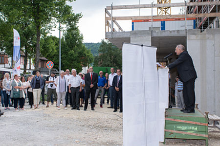 Mitte Oktober 2016 war Spatenstich für das DRK-Seniorenzentrum Geislingen, jetzt im Juli – 39 Wochen später – konnte bereits Richtfest gefeiert werden. Die Zahl von über 100 Gästen stellt das große Interesse der Öffentlichkeit an diesem Projekt unter Beweis.