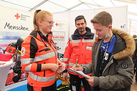 Kompetente Ansprechpartner*innen: Bei einer Ausbildungsmesse im Göppinger Stauferpark waren die Auszubildenden des DRK-Kreisverbandes gefragte Gesprächspartner*innen.