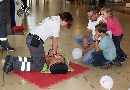 Ärzte und DRK-Aktive sensibilisieren im Nel Mezzo Passanten für Wiederbelebung.